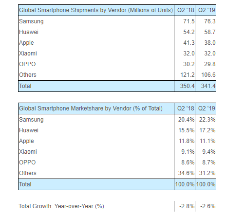 Trimestrul 2 din 2019 = lunile aprilie, mai și iunie. Informațiile sunt preluate din două surse: Strategy Analytics și Counterpoint, iar monitorizate sunt livrările de smartphone-uri.