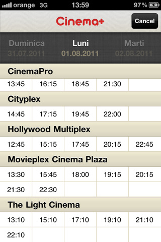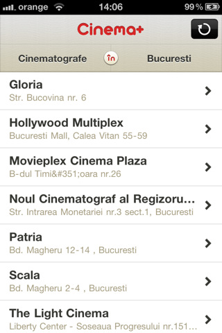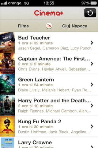 Cinema+ ofera gratuit utilizatorilor de iPhone printr-o aplicatie intuitiva si usor de folosit programul la zi al cinematografelor din marile orase ale tarii (Alba Iulia, Arad, Bacau, Baia Mare, Bistrita, Botosani, Braila, Brasov, Bucuresti, Buzau, Calarasi, Cluj Napoca, Constanta, Craiova, Deva, Dragasani, Iasi, Oradea, Piatra Neamt, Pitesti, Ploiesti, Ramnicu Valcea, Sibiu, Targu Jiu, Targu Mures, Timisoara, Vaslui).