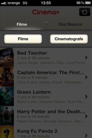 Meniul principal al aplicatiei afiseaza implicit filmele din orasul selectat insa preferintele setate sunt memorate si la repornirea aplicatiei. Tot meniul principal permite si afisarea cinematografelor dintr-un anumit oras.