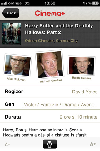 Informatiile unui film selectat cuprind: durata, actorii si regizorul, genul, rezumatul si cel mai important: programul pentru fiecare cinematograf.