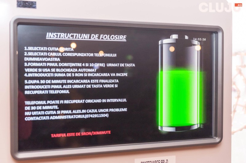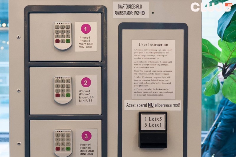 Pe fiecare staţie există câte 6 cutii ce conţin mai multe cabluri cu mufe diferite. Doritorii introduc smartphone-ul într-una dintre aceste cutii, iar cât timp telefonul este la încărcat ei se pot plimba liniştiţi. Cutia se închide pe baza unui PIN, iar o încărcare durează 30 de minute. Preţul este de 5 lei, iar dacă aveţi nevoie de telefon mai devreme acesta poate fi scos oricând pe baza PIN-ului.