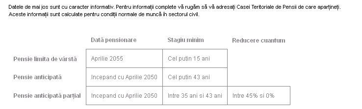 Eu am făcut rapid acest exerciţiu şi în condiţii de muncă standard, mă voi pensiona în 2055, cu condiţia să am cel puţin 15 ani vechime în muncă. Testul poate fi accesat aici.