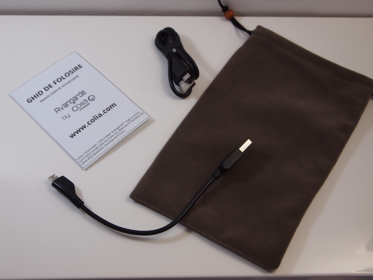 Cutia în care am primit bateria este din carton, iar pe partea din față are o suprafață din plastic transparent pentru a vedea produsul fără să desfacem pachetul. Alături de Colia.Power Avangarde mai există două cabluri microUSB – USB, unul de 20 cm și celălalt de 60 cm, o husă de protecție din material textil și un micuț ghid de folosire.