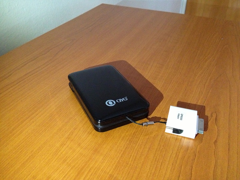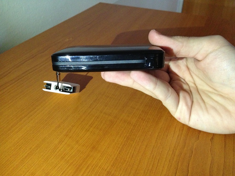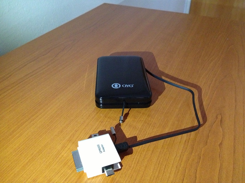 Designul compact este şi punctul forte pe care se axează şi producătorul. Vine într-o cutie simplă şi are doar adaptorul din poza de mai sus. Adaptorul este multifuncţional, având dispuse 3 mufe – pentru iPhone/iPad, micro-USB şi mini-USB. De asemenea, are şi un port standard USB, mascat frumos în carcasa bateriei.