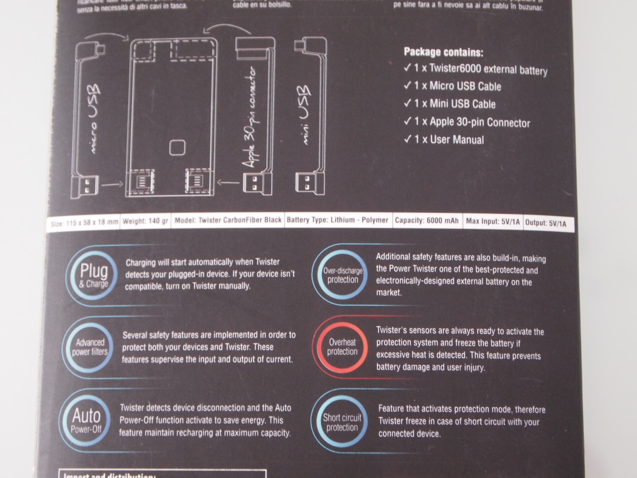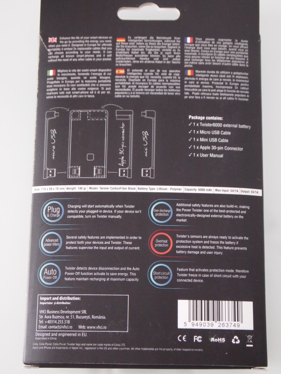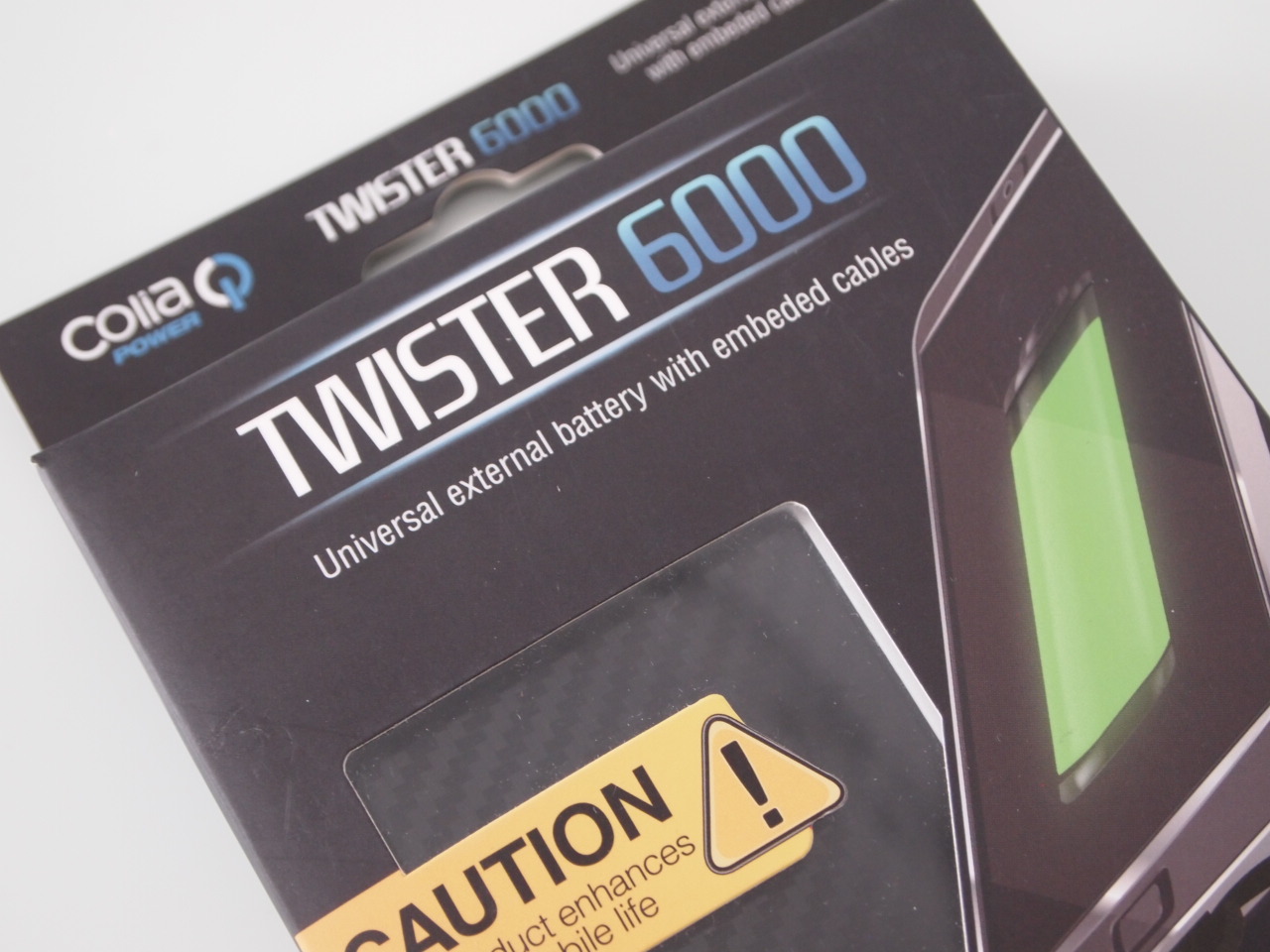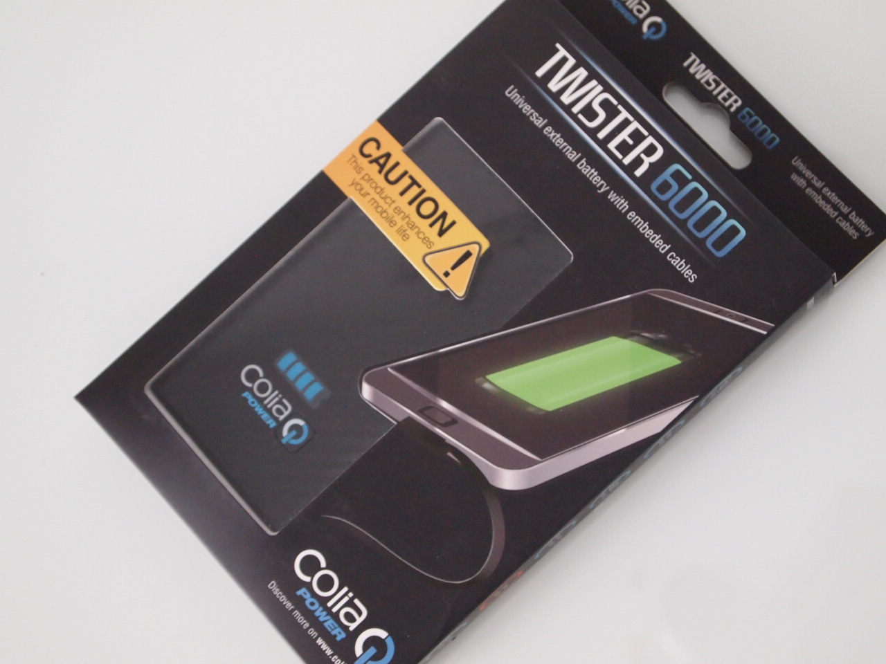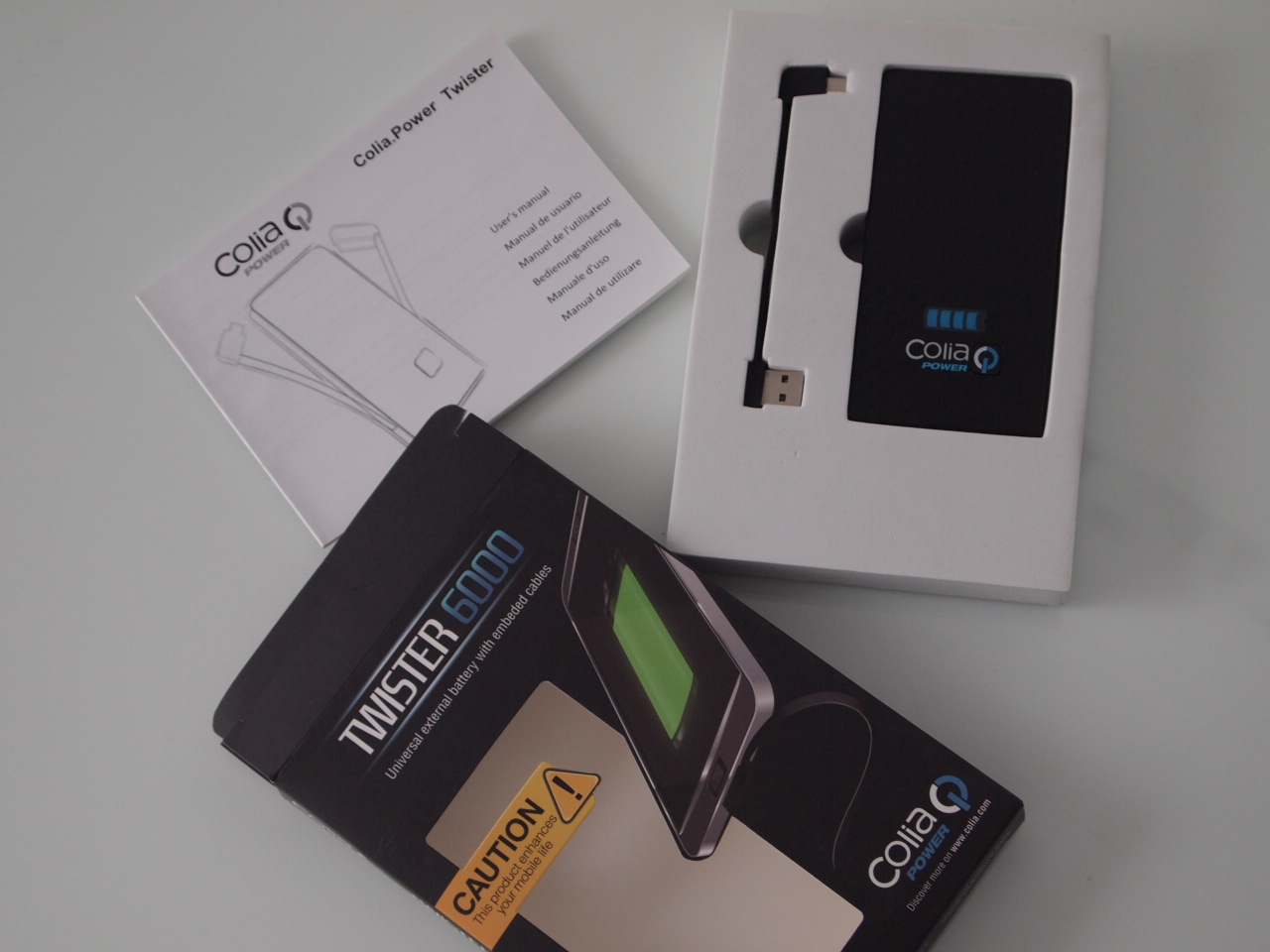 Cutia în care vine Colia.Power Twister 6000 este de carton și prezintă o folie tansparentă pe partea din față. Prin ea se poate vedea bateria fără să deschidem pachetul. Dacă totuși facem asta, vom găsi înăuntru alături de bateria propriu-zisă și un cablu miniUSB – USB și un manual de utilizare.