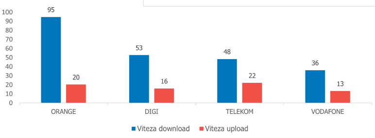 - Orange – viteză medie de 95 Mbps pe download şi 20 Mbps pe upload;
