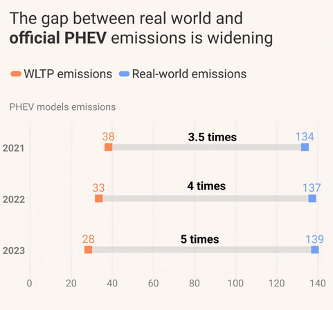 Observaţi că în analiza anului 2023, maşinile cu motoare Plug-in Hybrid (PHEV) au emis de până la 5 ori mai mult CO2 decât datele oficiale WLTP.