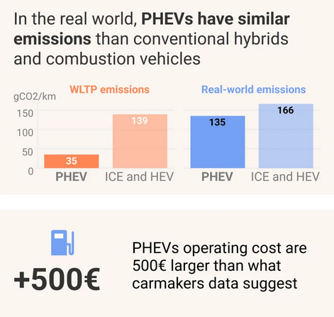 • emisiile de CO2 ale maşinilor cu motoare PHEV sunt mult mai mari decât cifrele oficiale WLTP promovate de producători: