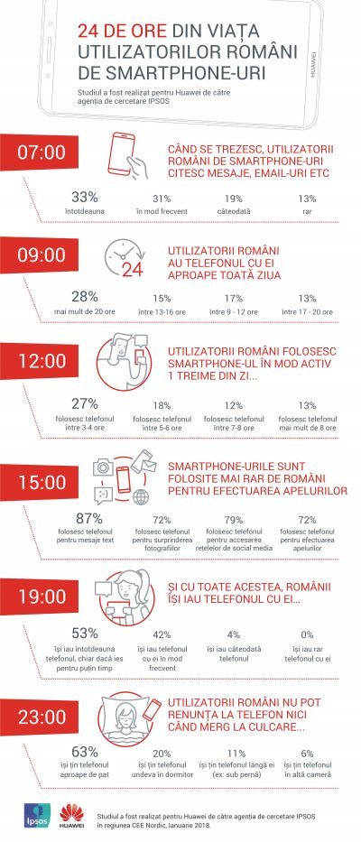 Este clar că smartphone-ul este gadget-ul care nu lipseşte omului modern, iar românii nu fac notă discordantă. Huawei şi-a dorit să afle care este comportamentul utilizatorilor în materie de smartphone-uri pe parcursul a 24 de ore, iar împreună cu compania multinaţională de cercetare de piaţă, IPSOS, a realizat un studiu în 12 ţări europene (inclusiv România) legat de acest aspect.