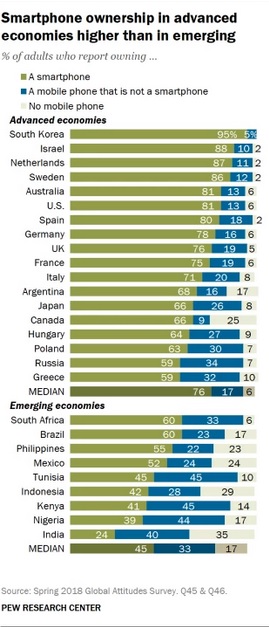 Analiza Pew Research Center a fost împărţită pe ţări dezvoltate economic şi ţări cu economii emergente. În primul caz avem o rată de adoptarea a smartphone-urilor de 76%, în timp ce în al doilea media este de doar 45%.