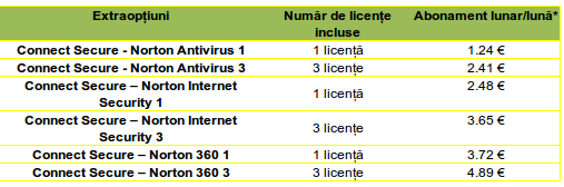 Noul serviciu Connect Secure este disponibil numai pentru abonaţii Cosmote şi este compatibil cu toate planurile tarifare de voce şi date. Extraopţiunile Norton vor avea o perioadă contractuală de minim două luni pentru activare şi o lună pentru reactivare.