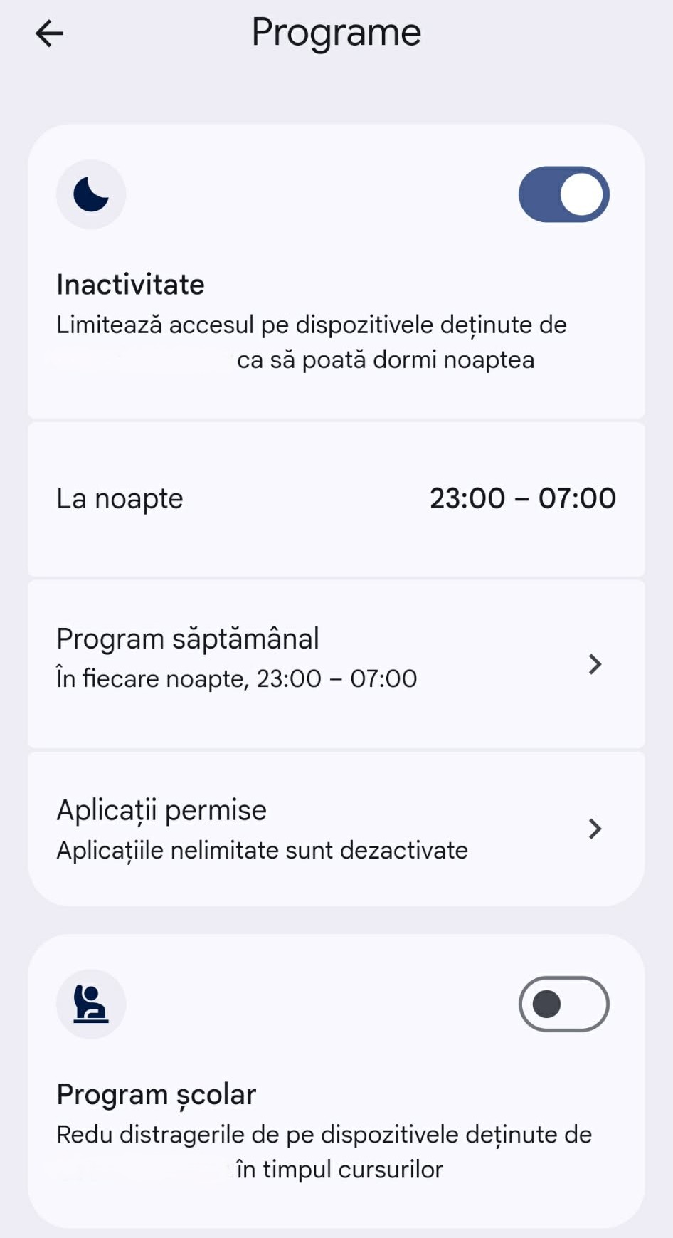 - Program de culcare (puteţi selecta un intervalul orar în care smartphone-ul / tableta să se blocheze automat. Aici puteţi permite ca unele aplicaţii să poată fi accesate în intervalul setat de inactivitate sau chiar bloca parţial sau total activitatea device-ului în timpul programului şcolar);