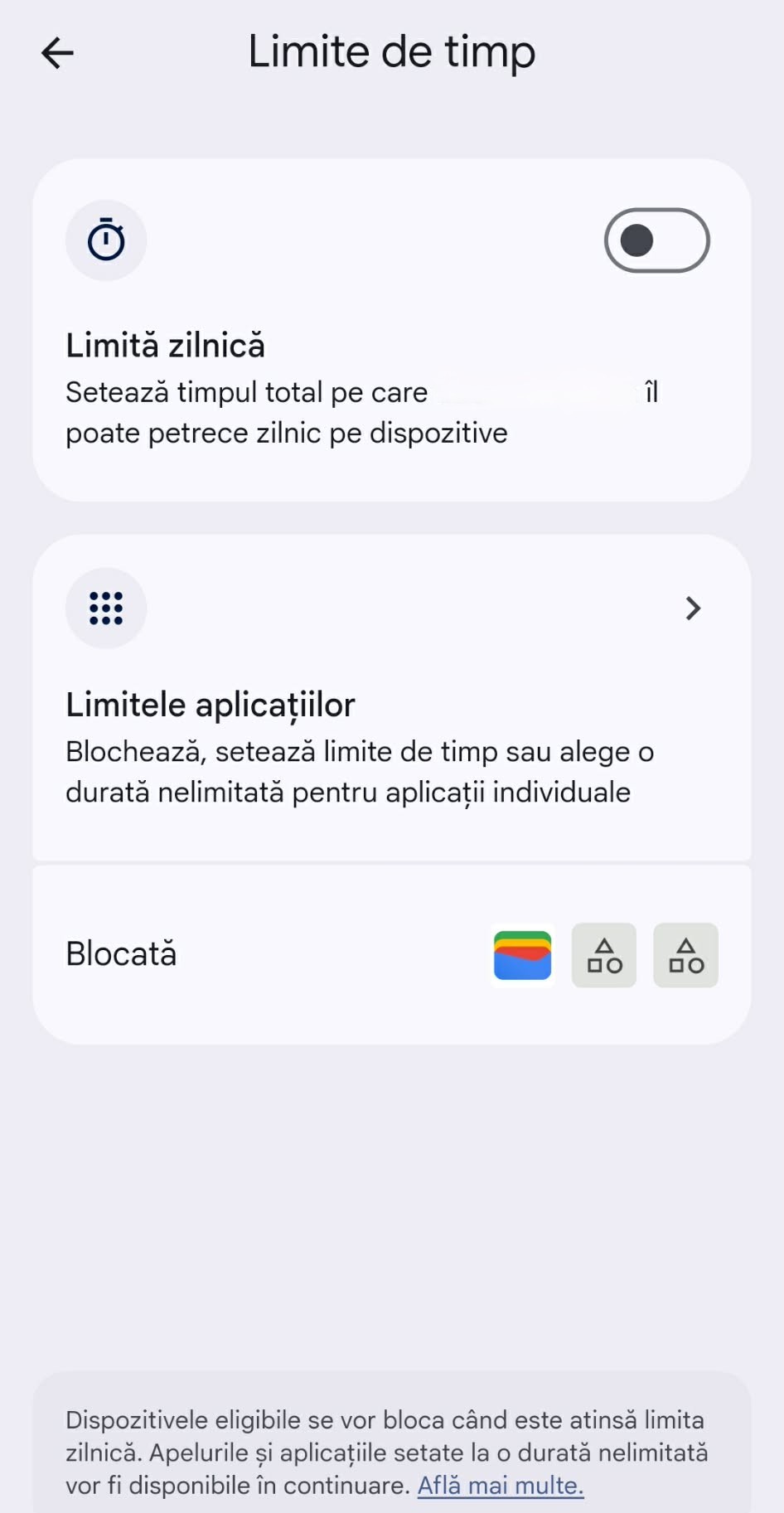 - Limite zilnice de timp sau chiar limite de timp la nivel de aplicaţii (puteţi seta cât timp poate sta copilul pe smartphone / tabletă sau chiar cât timp poate sta pe o anumită aplicaţie);