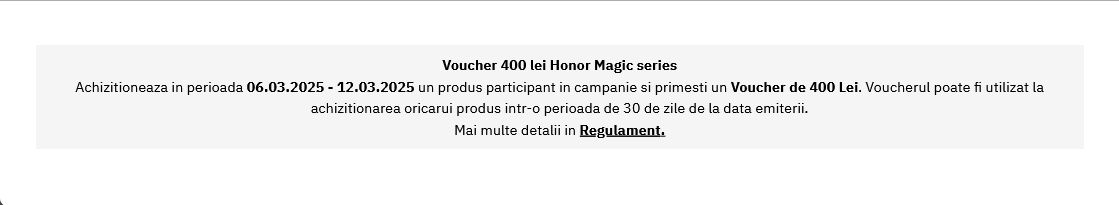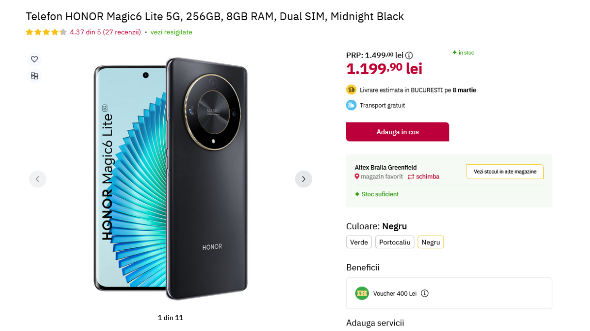 Honor Magic6 Lite pe negru în versiunea cu 8 GB RAM şi 256 GB stocare poate fi achiziţionat la Altex (fie online, fie în magazin) la preţul standard de 1199.90 lei. Nimic deosebit aici, acesta este preţul normal, doar că până pe 12 martie primeşti înapoi şi un voucher de 400 lei, unul pe care îl poţi utiliza ulterior la achiziţia oricărui produs de la Altex.