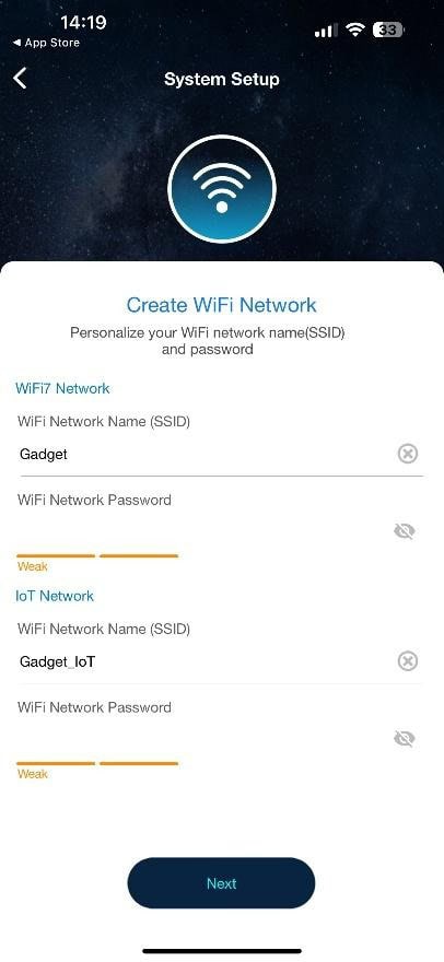 Scanezi QR-ul de pe spatele routerului, aplicația se conectează la rețeaua default și configurează apoi propria ta rețea WiFi.