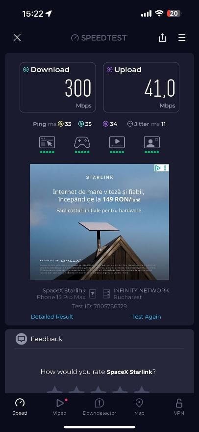 În primă fază am testat viteza în rețeaua Starlink, în cameră cu routerul. Vitezele de download au variat – 219 Mbps, 231 Mbps și 281 Mbps, la fel și cele de download: 31.5 Mbs, 31.4 Mbs și 24 Mbps. Am dedus o medie de 243,67 Mbps la download și de 28.97 Mbps la upload.
