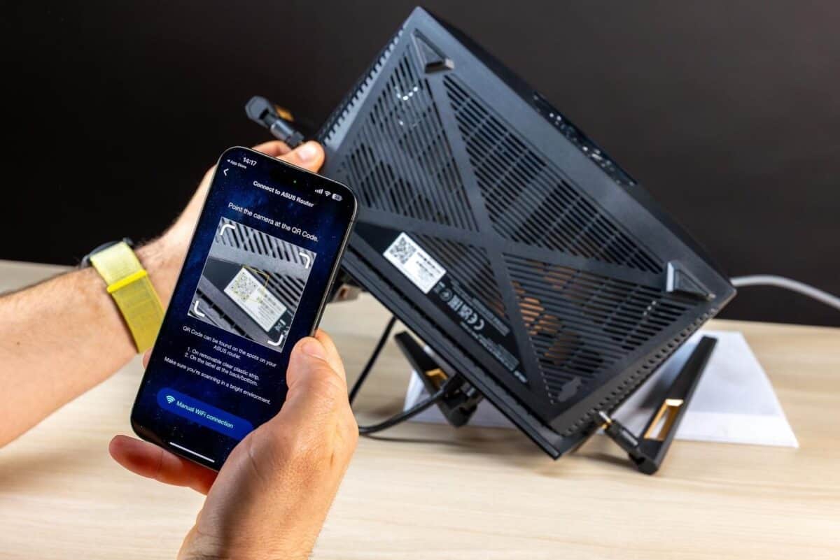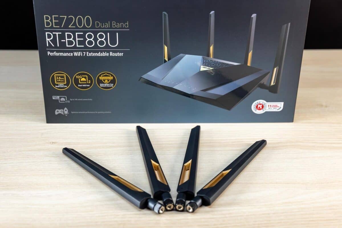 În cazul de față am optat pentru un router ASUS RT-BE88U. Este un model dual-band WiFi 7 de tip extensibil AiMesh. Oferă viteze de până la 7.200 Mbps și folosește tehnologii precum Multi-Link Operation (MLO) și 4K-QAM pentru a reduce latența, a gestiona mai bine traficul și a crește eficiența transferului de date pe benzile de 2,4 GHz și 5 GHz.
