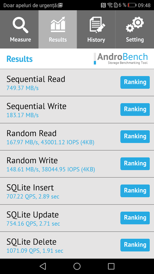 În acest context vine și întrebarea din titlu. Una dintre soluțiile de verificare, instalați Androbench și rulați benchmark-ul. La rezultate vă uitați la capătul de listă: Sequential Read. În cazul meu, pe Huawei P10 am obținut 749.37 MB/s. Pot trage concluzia că pe exemplarul meu am stocarea mai rapidă / bună.