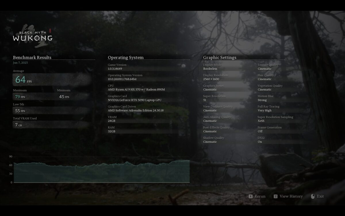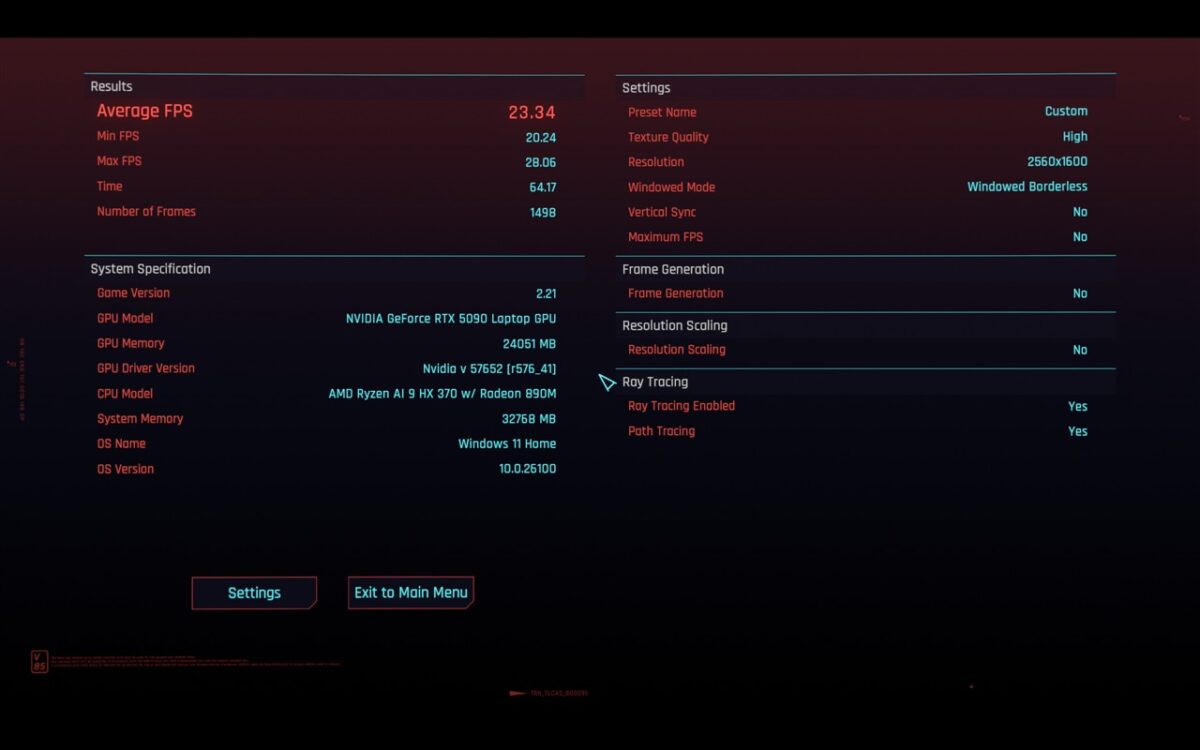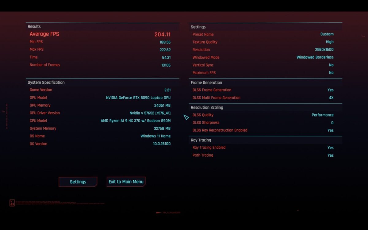 Testele au fost rulate la rezoluția maximă a ecranului laptopului Razer Blade 16, adică la 2560 x 1600 pixeli și cu mai toate detaliile grafice la maxim. Cu siguranță NVIDIA GeForce RTX 5090 Laptop ar fi făcut față fără probleme și la rezoluție 4K, oferind prin puterea DLSS 4 un fps suficient de ridicat pentru un gameplay cursiv.