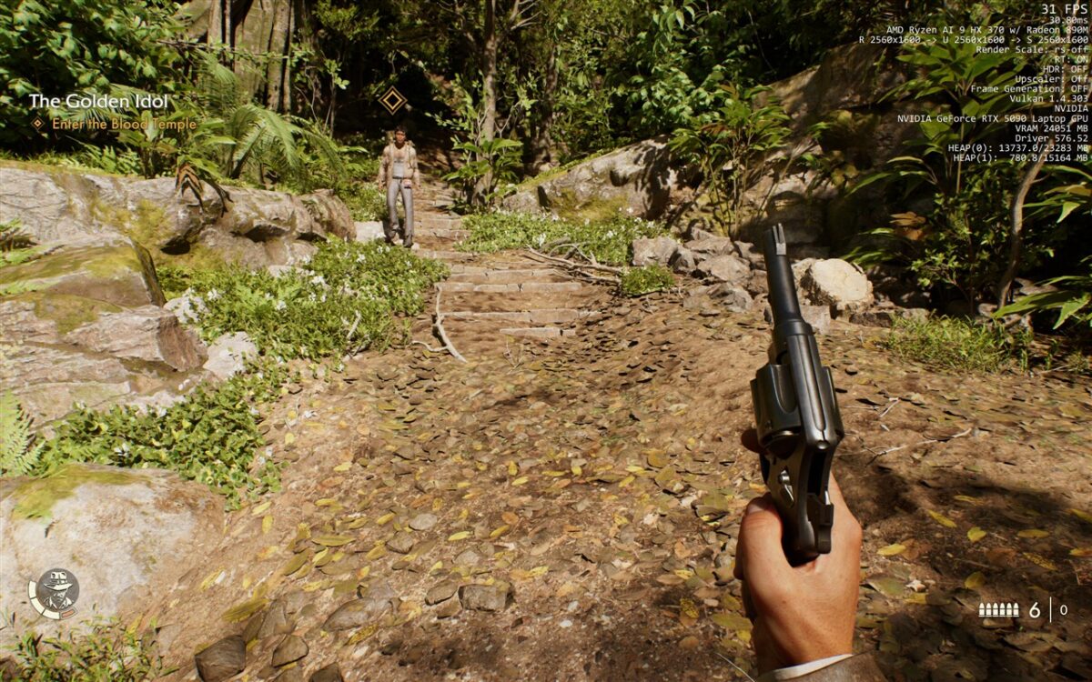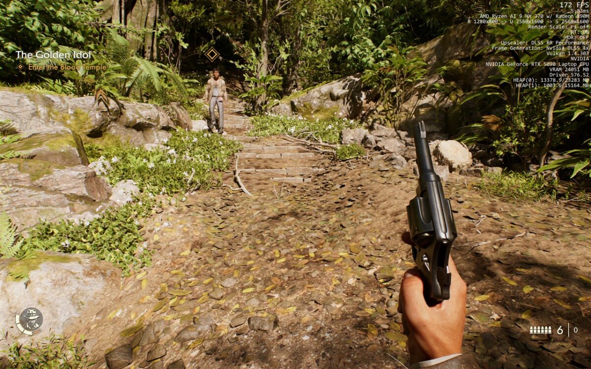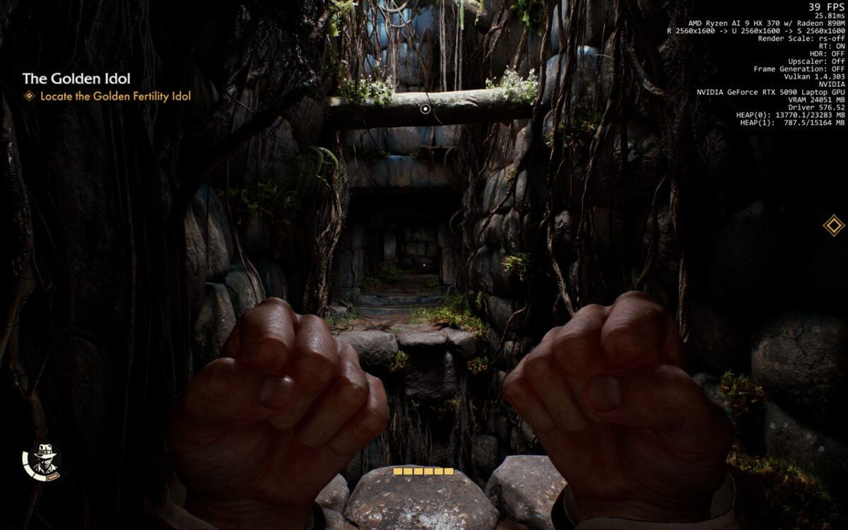 Dar, haideți să vedem și ceva exemple practice, să le numim, despre cum se descurcă NVIDIA GeForce RTX 5090 Laptop în trei dintre cele mai folosite jocuri pentru astfel de teste. Atât Indiana Jones and the Great Circle, cât și Black Myth: Wukong și Cyberpunk 2077 suportă DLSS 4 cu Multi Frame Generation, deci le-am pus la treabă pe toate trei atât cu această tehnologie activată, cât și cu ea oprită. Diferențele sunt uriașe în două dintre cazuri, așa cum se poate observa din capturile de ecran de mai jos: