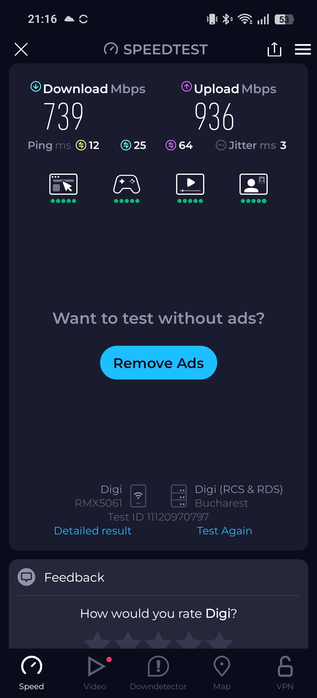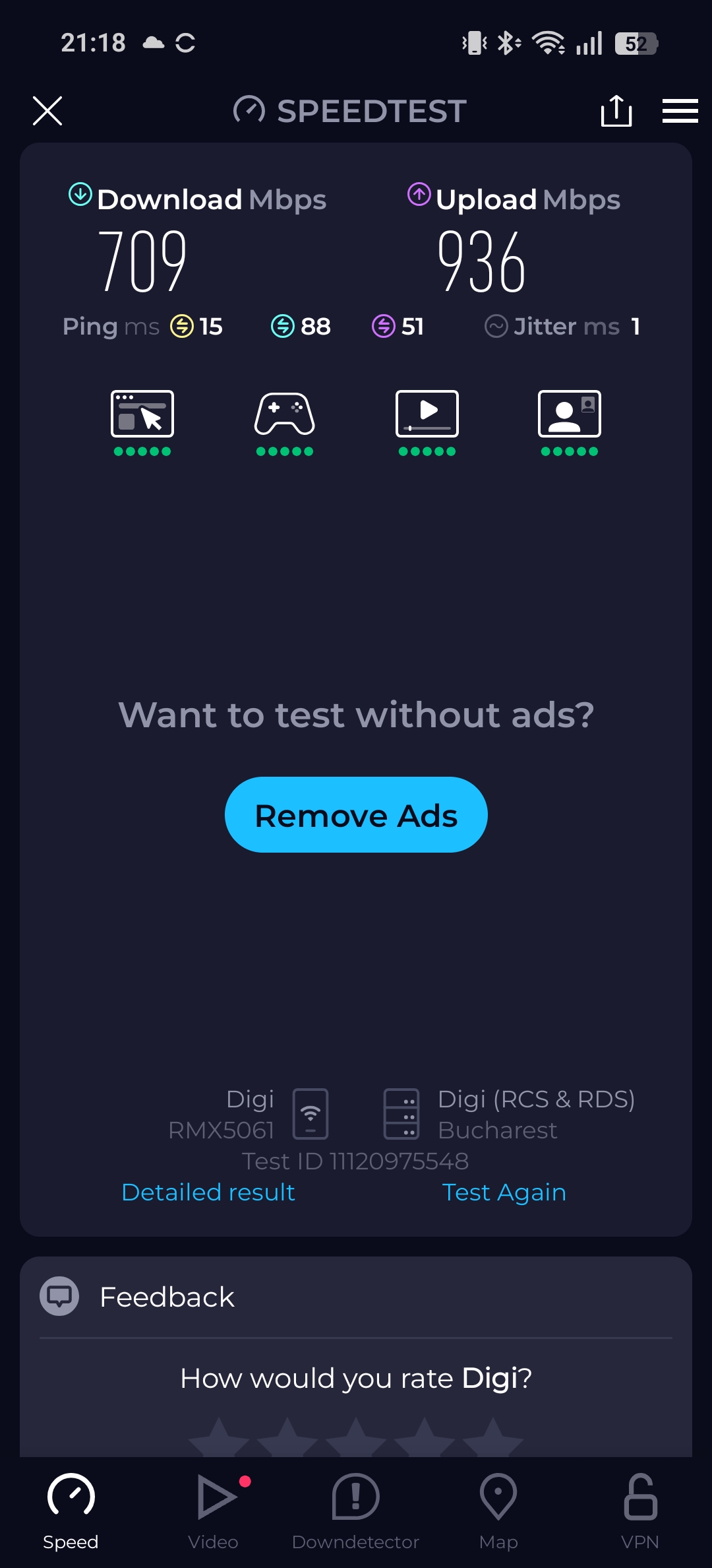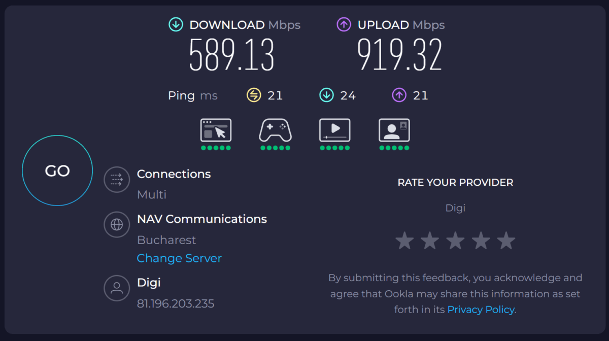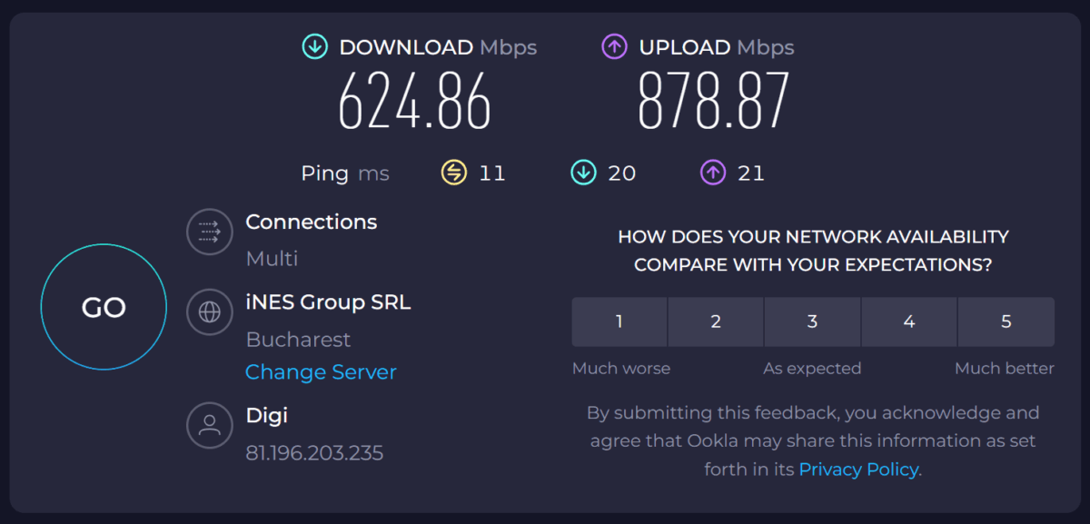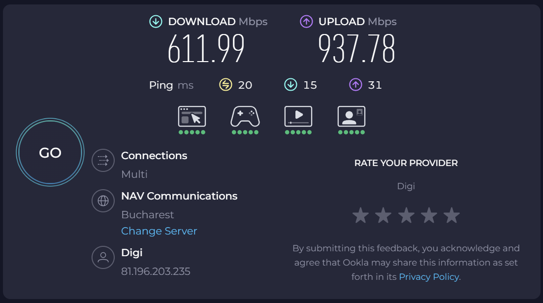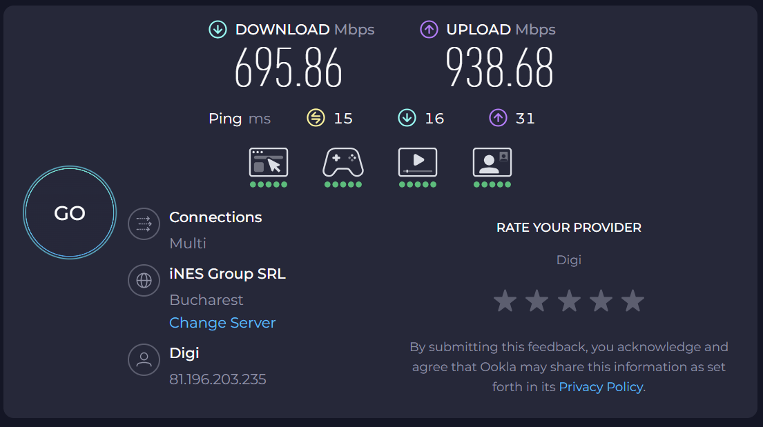 După ce am instalat routerul, am făcut mai multe teste de viteză, prin conexiunea mea la internet, care este de maxim 1000 Mbps. Așa cum puteți observa din capturile de ecran de mai jos, Tenda TE6L Pro se apropie tare de maximul conexiunii mele, așa că nimic de reproșat pe această direcție.