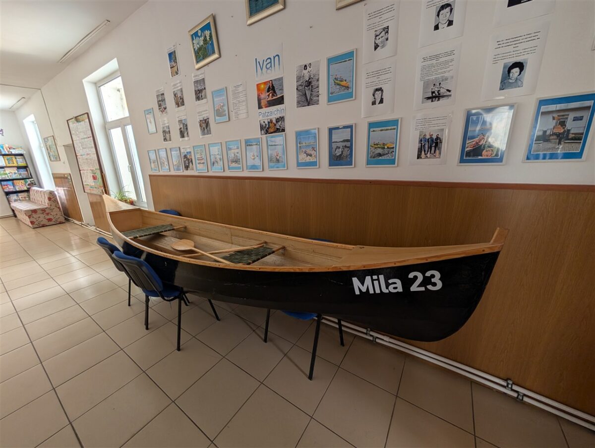 Pe hol era o barcă concepută de către elevii școlii, complet funcțională și testată pe canalul din fața unității (pontonul se afla la aproximativ 30 – 50 metri distanță). Una dintre doamnele profesoare mi-a arătat cabinetul de muzică, unul dotat de către comunitatea lipoveană. Băncile erau într-un albastru specific zonei, iar costumele erau poziționate spre a fi admirate în vitrine dedicate.