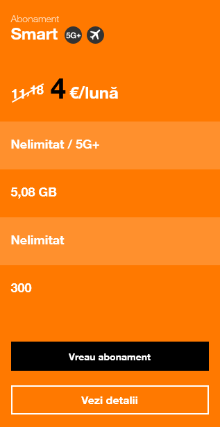 - Abonamentul Smart la 4 euro / lună ce vine cu minute si SMS-uri naţionale nelimitate, internet mobil 5G+ nelimitat, 5.08 GB internet mobil în roaming şi 300 de minute internaţionale în SEE;