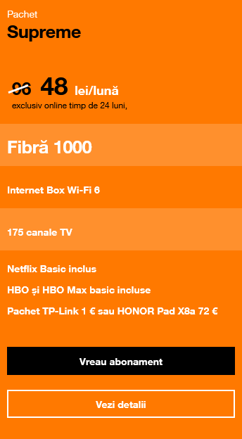 - Pachetul Supreme la 48 lei / lună ce vine cu internet de mare viteză Fibră 1000 cu viteze în download de până la 940 Mbps, 175 canale TV din care 103 HD şi cele mai importante competiţii sportive, abonament Netflix Basic şi abonament HBO Max Basic.