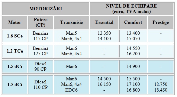 - în ce privește motorizările: 2 unități pe benzină și 2 unități diesel (Benzină – SCe 115 cu 4×2 sau TCe 125 cu 4×2 și 4×4, Diesel – dCi cu 90CP și configurație 4×2, dar și dCi de 110 CPC cu 4×2 și 4×4);