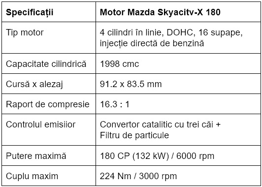 Ce înseamnă toate astea? În primul rând vedem în dreptul specificațiilor un cuplu motor ceva mai ridicat pentru un motor pe benzină de 2 litri, fără supraalimentare (există compresor mecanic, dar pentru altceva). Apoi, acei 224 Nm sunt disponibili de la 3000 rpm, față de cei 213 Nm ai motorului Skyactiv-G 165 ce sunt atinși abia la 4000 rpm. Pe scurt: ceva mai mult cuplu la o turație mai joasă.