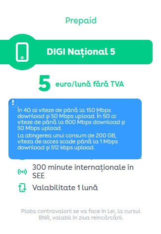 - pentru opţiunea DIGI Naţional 5 viteza va fi limitată după consumarea a 200 GB de internet mobil;