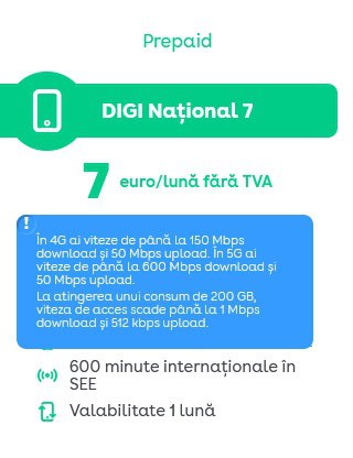 - pentru opţiunea DIGI Naţional 7 viteza va fi limitată după consumarea a 200 GB de internet mobil.