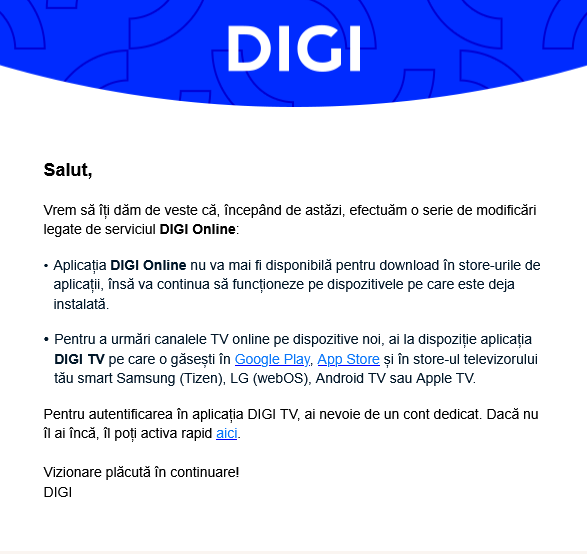 Doar că la câteva ore distanţă DIGI a aprins fitilul şi a aruncat bomba: renunţă la Digi Online. Cel mai mare operator de telecomunicaţii din România a transmis azi că aplicaţia oficială de streaming live şi video on demand Digi Online va fi înlocuită pe toate platformele cu DIGI TV.