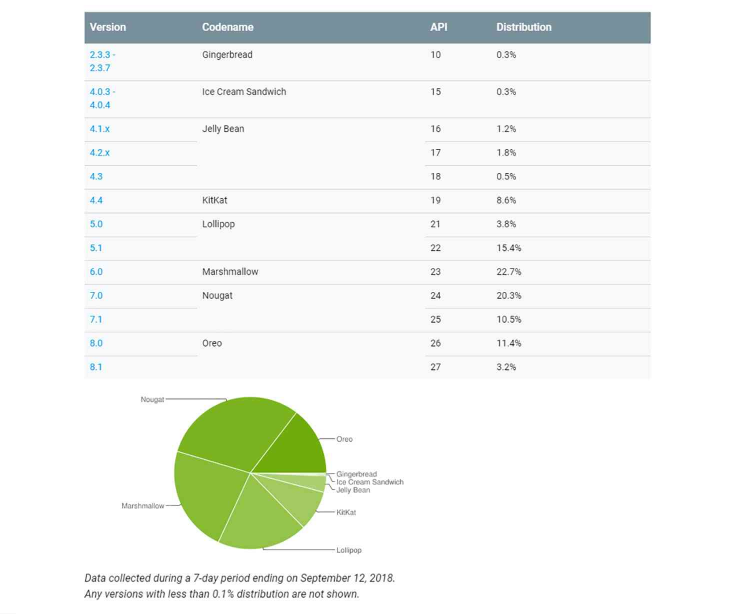 Distribuția versiunilor Android la 12 septembrie 2018: