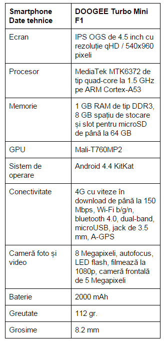 Specificațiile hardware încorporate de Doogee Turbo Mini F1: