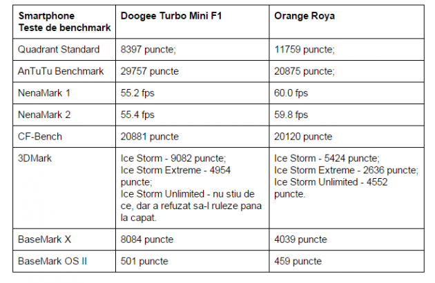 A trecut prin mai multe teste de benchmark, iar rezultatele sunt poziționate în tabel, comparativ și cu Orange Roya: