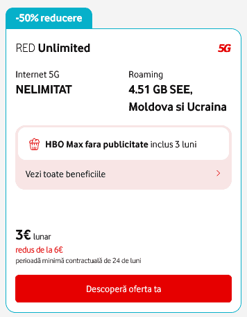 Iată că la scurt timp avem o ofertă similară şi la Vodafone. Operatorul roşu oferă o reducere de 50% pe toată perioada contractuală de 24 de luni pentru abonamentul RED Unlimited, cel care ajunge astfel la acelaşi cost de 3 euro / lună.