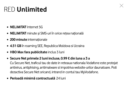 În aceşti bani primiţi internet naţional 5G nelimitat, minute şi SMS-uri naţionale şi în roaming SEE nelimitate, 200 de minute internaţionale, 4.51 GB internet în roaming SEE, HBO Max fără publicitate inclus 3 luni şi Secure Net inclus 2 luni.