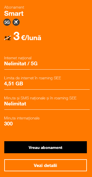 Cel mai bun abonament la portare este Orange Smart, cel ce costă doar 3 euro / lună şi oferă internet naţional 5G nelimitat, minute şi SMS-uri naţionale şi în roaming SEE nelimitate, 300 de minute internaţionale şi 4.51 GB internet în roaming SEE.