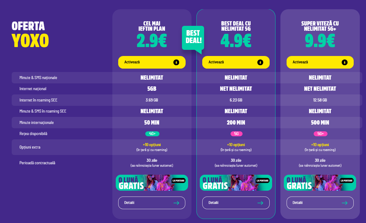 - YOXO SUPER VITEZA NELIMITAT 5G+ (nelimitat internet pe mobil 5G+ din care 12.58 GB în roaming SEE, minute şi SMS-uri naţionale nelimitate, 500 de minute internaţionale) – 9.9 euro / lună.