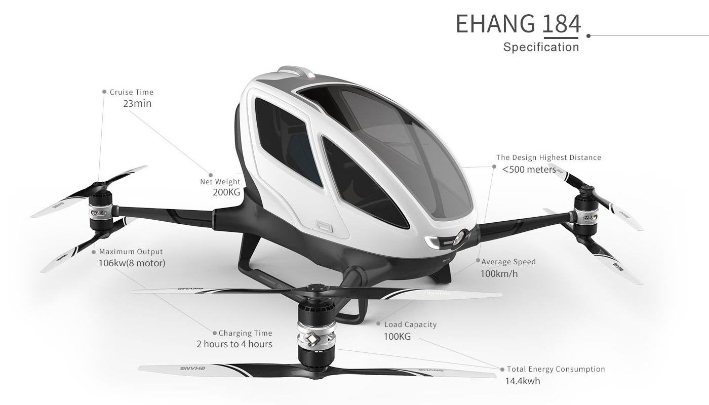 EHANG 184 nu reprezintă tocmai o noutate, fiind prezentată în cadrul CES 2016. Atunci nu am simțit nevoia să vă aduc informații despre ea, întrucât nu credeam vreo clipă că va trece de stadiul de prototip. Apoi au început să curgă mai multe detalii și chiar s-a vehiculat un preț, chiar dacă într-o marjă cam mare – între 200.000 și 300.000 dolari.