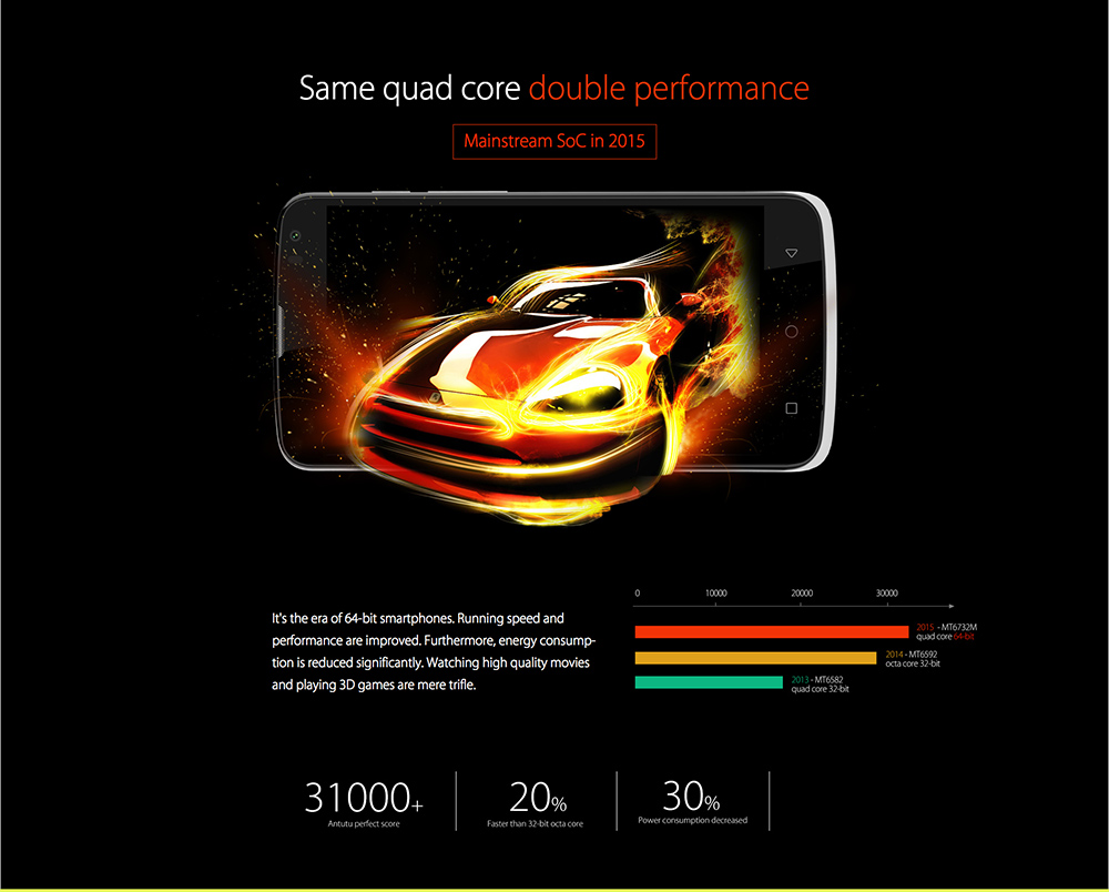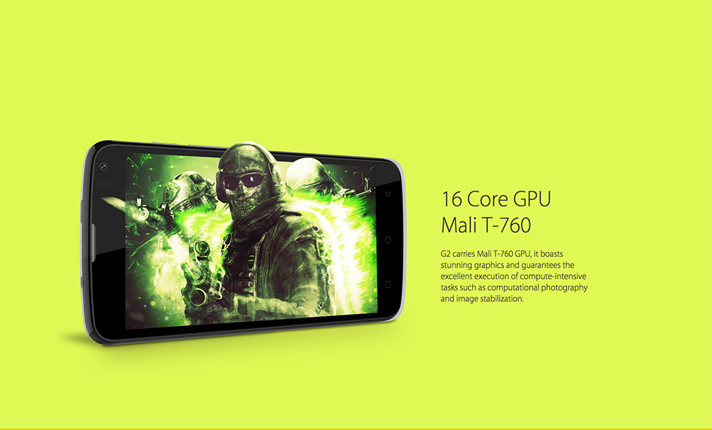 – procesor quad-core MediaTek MT6732 pe 64 biţi tactat la 1.3 GHz şi accelerator grafic Mali T760;