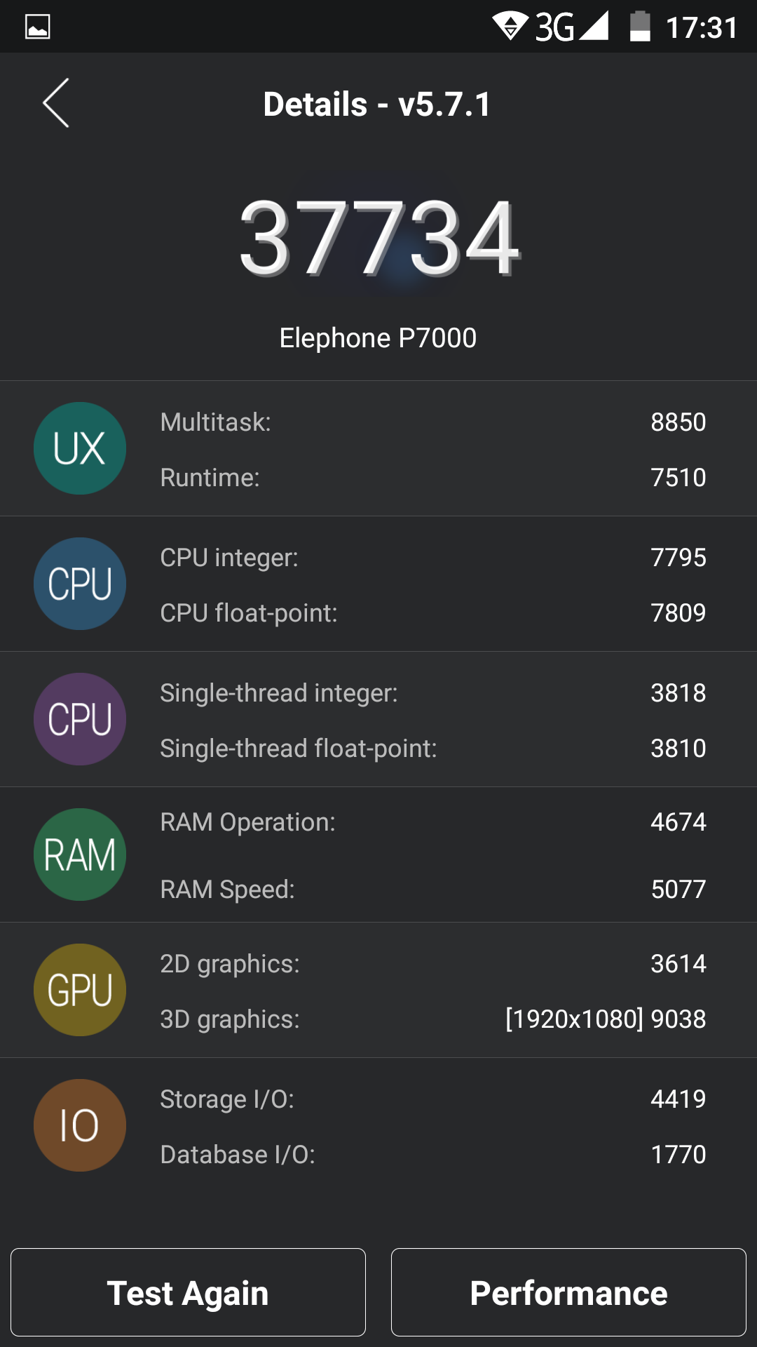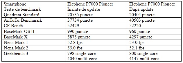 Am trecut device-ul şi prin câteva teste de benchmark atât cu soft-ul de bază, cât şi după update. Există câteva modificări şi în aceste rapoarte, însă schimbările în bine se simt cel mai bine în utilizarea zilnică. Testele de benchmark încadrează Elephone P7000 Pioneer într-o zonă medie a performanţelor, iar personal le consider mulţumitoare.