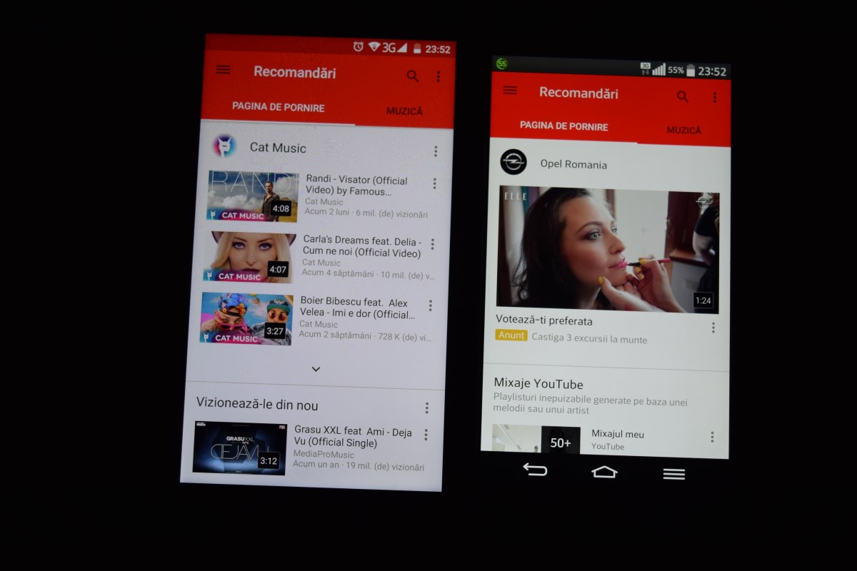 Calitatea display-ului este una medie (la uşoare apăsări pe ecran cu fundal negru apar rapid urme de culoare deranjante), culorile redate sunt plăcute şi naturale, unghiul de vizualizare foarte bun, răspunsul la comenzi ireproşabil, iar luminozitatea excelentă după update-ul de soft. Pentru a vă face o idee de ce este foarte important update-ul adus de Elephone, vă prezint diferenţele la 100% luminozitate între Elephone P7000 Pioneer şi LG G2-ul personal: