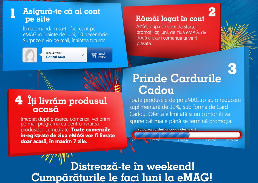 Luni, 10 decembrie, site-ul eMag.ro împlineşte frumoasa vârstă de 11 ani. În decembrie 2001, eMag.ro pleca la un drum lung, un drum cu multe încercări, dar care la sfârşit de 2012 i-a adus pe primul loc în topul comerţului online din România.