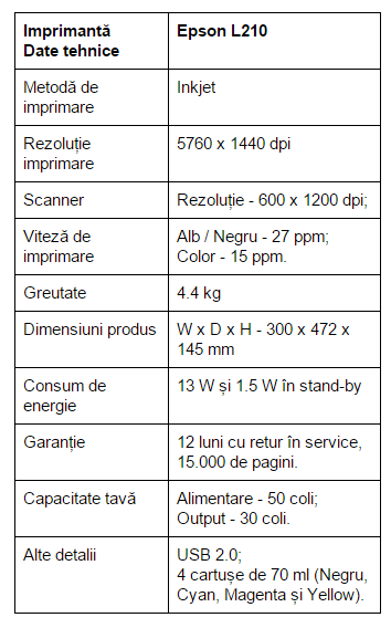 Câteva din specificațiile lui Epson L210: