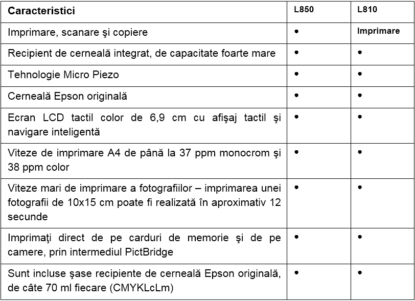 Prețurile maxime recomandate de producător pentru Epson L810 și L850 sunt de 2025 lei, respectiv 2188 lei.