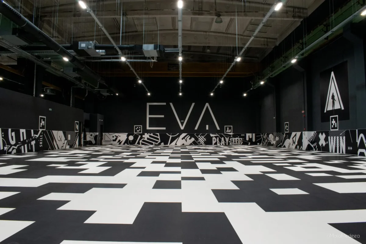 EVA este un brand născut în Franța și prezent în peste 50 de locuri din întreaga lume (85 până la finalul anului), în orașe precum Paris, Madrid, Bahrein sau Kuala Lumpur. În București, spațiul găzduiește două arene de câte 500 m², unde două echipe formate din până la 5 jucători fiecare (deci maxim 10 jucători prezenți simultan pe o arenă) își pot testa reflexele și strategia într-un cadru virtual, realist și dinamic.