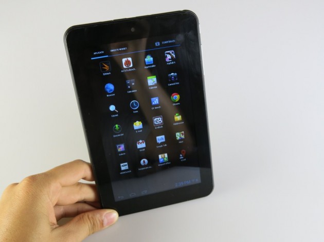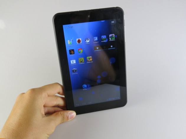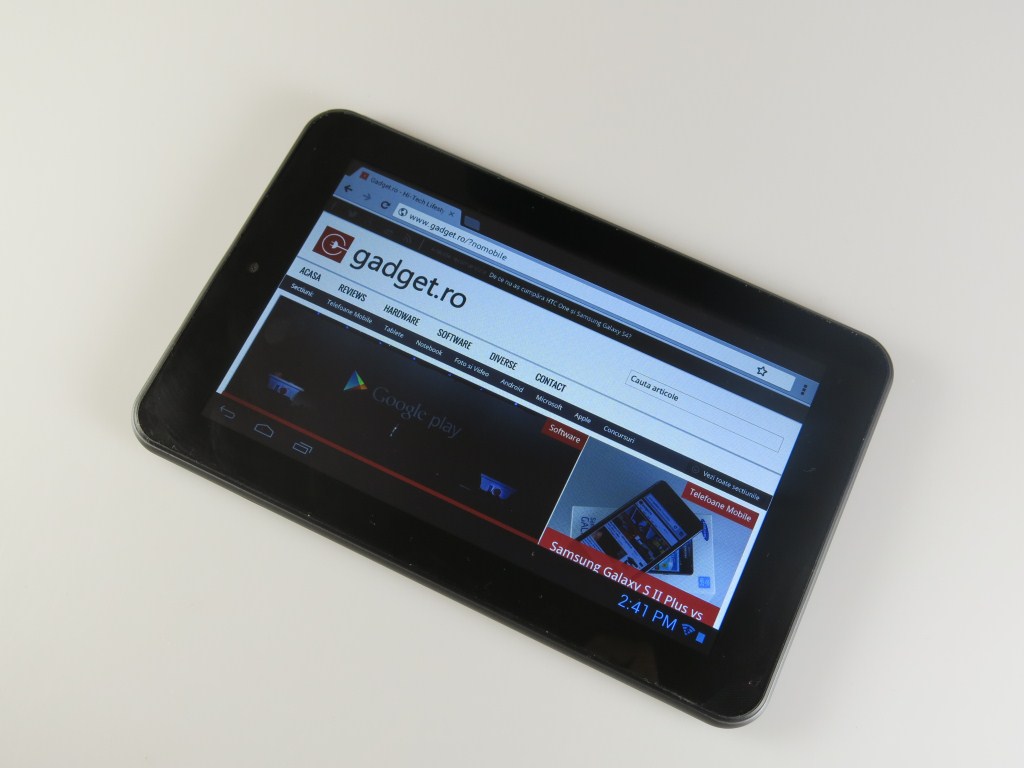 TFT de 7 inch de tip capacitiv, multitouch, 1024×600 pixeli. Touch-ul răspunde rapid comenzilor. Trebuie să-i dăm Cezarului ce-i aparține și să spun că marele minus la display îl reprezintă unghiul redus de vizualizare și efectul de glare / redare a spațiului ambiant pe display. Totuși, acolo unde lumina nu-i la intensitate maximă aș zice că se descurcă onorabil, un plus sesizabil față de tabletele de 7 inch cu 480×800 pixeli.