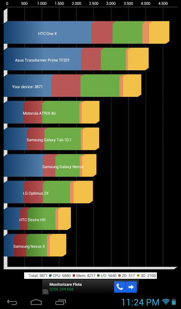 Normal că și Evotab HD a trecut prin câteva aplicații de benchmark. M-am gândit că ar fi utilă o comparație cu ASUS Memo Pad / tabletă care recent de la peste 700 de lei a ajuns la 599 lei – procesor single core VIA la 1 GHz, 1 GB memorie RAM, Android 4.1 Jelly Bean, Mali-400 GPU, display LED-backlit de 7 inch cu rezoluție 1024×600 pixeli. Allview AX2 Frenzy este o altă tabletă ieftină cu CPU dual-core care la sub 600 de lei oferă și conectivitate 3G. AX2 Frenzy integrează un CPU Mediatek dual-core la 1 GHz, 512 MB RAM, PowerVR SGX531, Android 4.0 Ice Cream Sandwich.